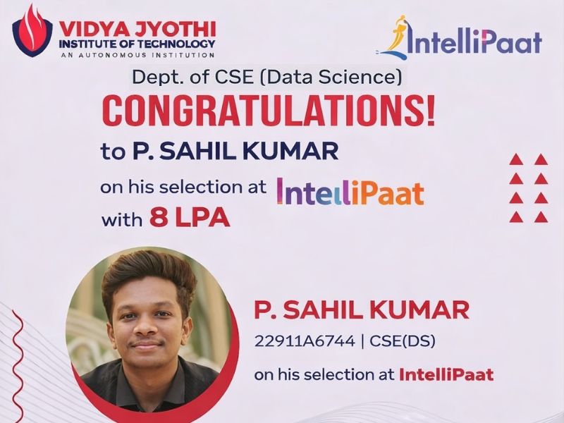 The Department of CSE(Data Science) proudly congratulates P. Sahil Kumar (22911A6744) on being successfully selected by Intellipaat with an impressive package of 8 LPA. This outstanding achievement reflects Sahil’s dedication, technical proficiency, and consistent effort in developing industry-relevant skills. His success highlights the department’s strong academic environment, practical training initiatives,…
