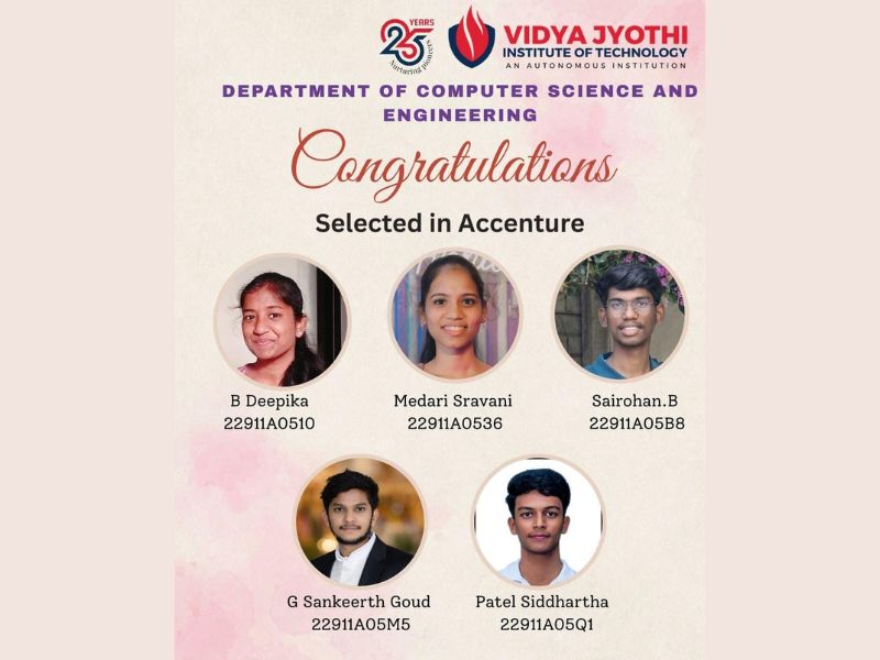 The Department of Computer Science and Engineering at Vidya Jyothi Institute of Technology proudly congratulates its students on their successful placement in Accenture. This significant achievement reflects the students’ dedication, technical competence, and commitment to excellence. It also highlights the strong academic foundation, continuous mentoring, and industry-oriented training provided by…