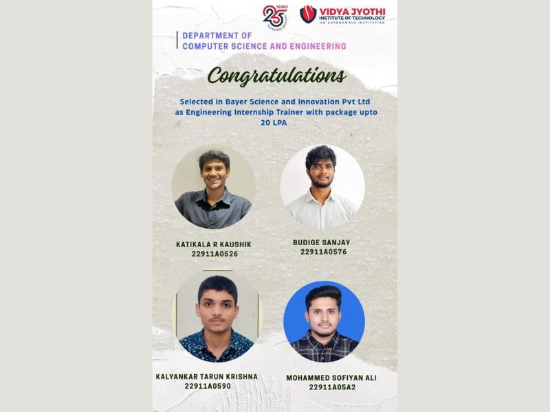 Since 1998, Vidya Jyothi Institute of Technology has been shaping bright minds into future engineers. Backed by passionate educators, VJIT stands out for its academic excellence with a 95% success rate and strong industry connections. With 82% average placements, we are committed to blending innovation with quality education, inspiring students to shine on a global stage.