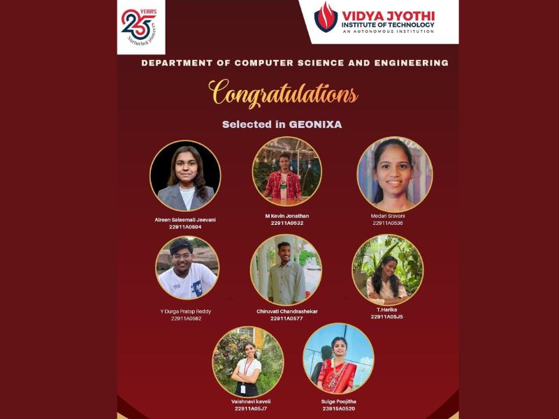 The Department of Computer Science and Engineering at Vidya Jyothi Institute of Technology proudly congratulates its students on their successful selection by Geonixa. This achievement reflects the students’ dedication, perseverance, and strong technical proficiency developed during their academic journey. This milestone also highlights the department’s continuous commitment to academic excellence,…