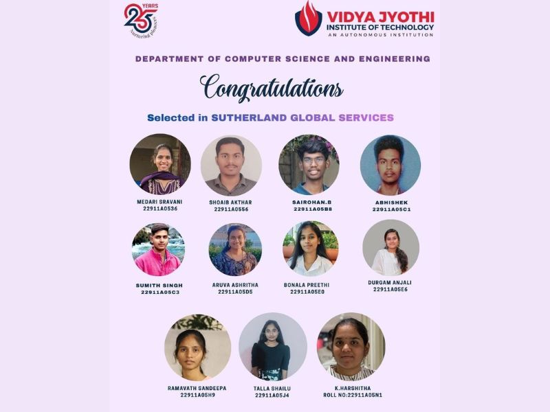 The Department of Computer Science and Engineering at Vidya Jyothi Institute of Technology proudly congratulates its students on their successful placement in Sutherland Global Services. This notable achievement highlights the students’ dedication, talent, and determination to excel in their professional pursuits. The success also reflects the department’s continuous commitment to…