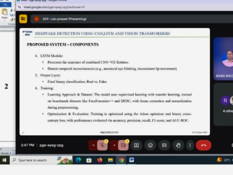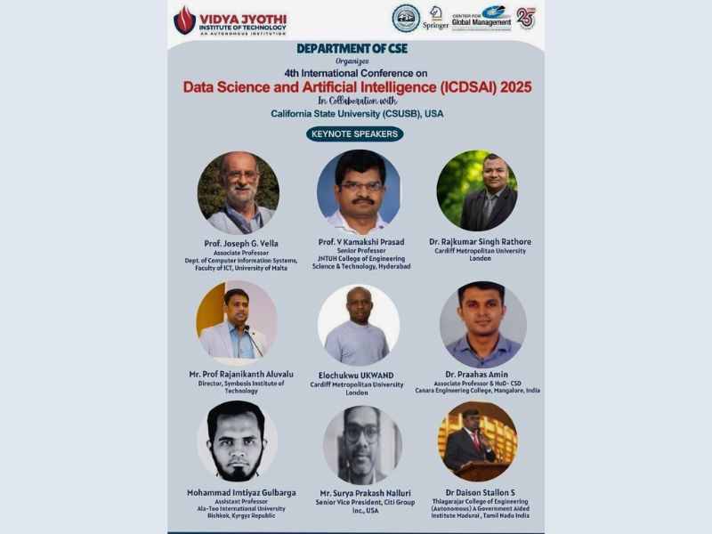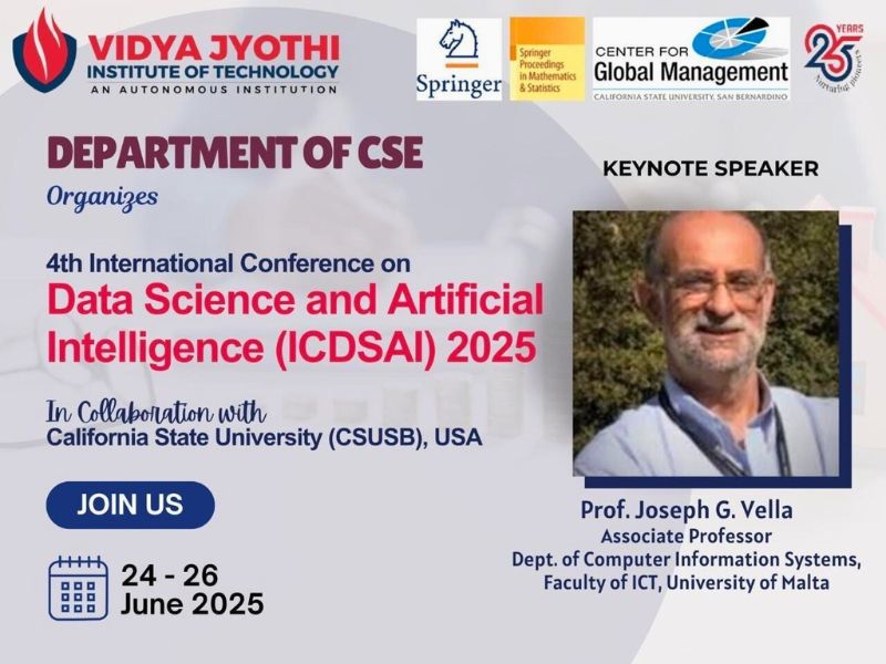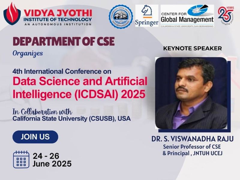 The Department of Computer Science & Engineering, Vidya Jyothi Institute of Technology (VJIT), organized 4th International Conference on Data Science and Artificial Intelligence (ICDSAI 2025) from 24th–26th June 2025, in collaboration with California State University, San Bernardino (CSUSB), USA. The conference was technically supported by Springer and the Center for Global Management.