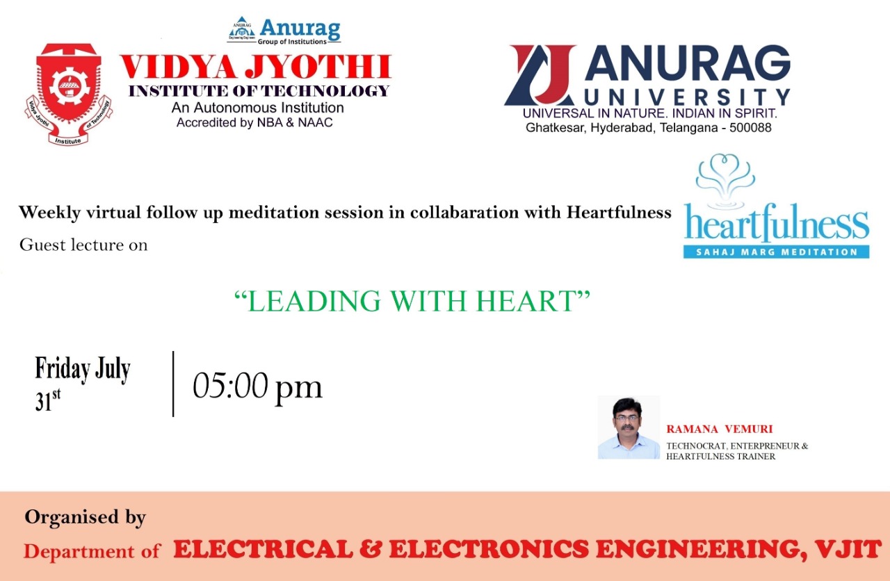 The Department of EEE has conducted a Guest Lecture in collaboration with Heartfulness on 31st July 2020 on “Leading with Heart” by Mr. Ramana Vemuri, Technocrat, Entrepreneur & Heartfulness Trainer.