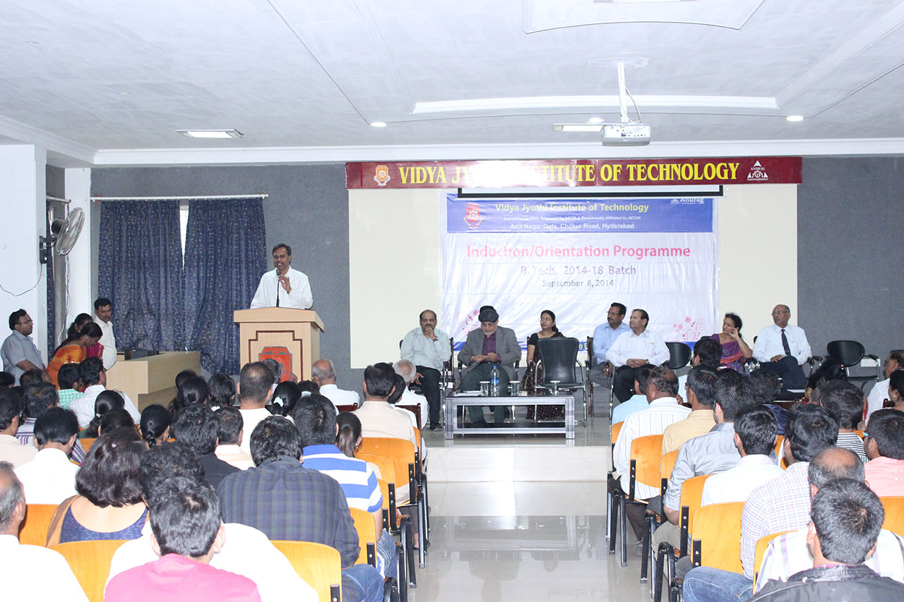 Orientation Programme for B.Tech 1st year was organized on 6th September 2014 at VJIT campus with lots of enthusiasm and freshness. Around 900 no’s students and parents attended the programme. Prof. Zafarullah (HOD-EEE) apart from his literary flow… detailed the audience about academic regulations. A senior student from each department briefed about their respective departments. EEE, ECE, MECH, CSE, IT, CIVIL.