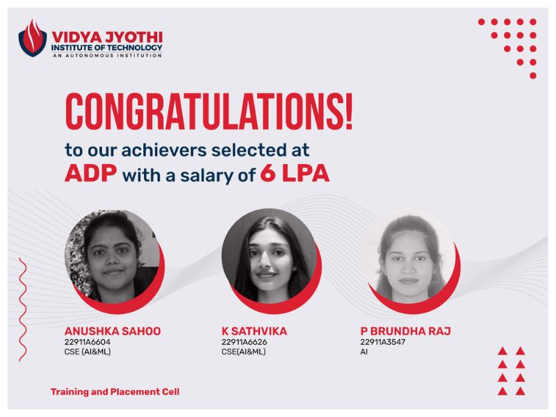VJIT proudly congratulates our talented students Anushka Sahoo, K Sathvika, and P Brundha Raj for securing prestigious placements at ADP with an impressive package of 6 LPA. Their dedication, technical excellence, and consistent hard work have paved the way for this remarkable success.