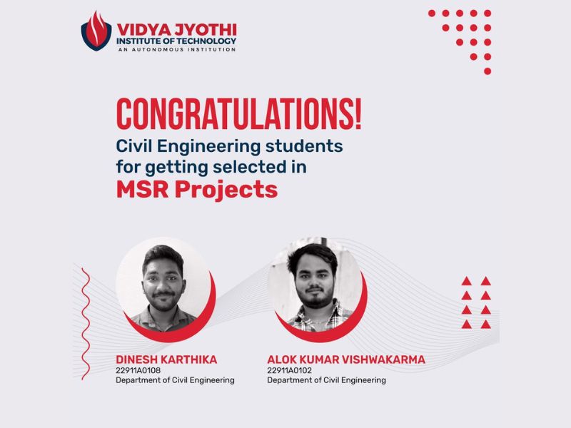 We are delighted to share that our talented Civil Engineering students, Dinesh Karthika and Alok Kumar Vishwakarma, have been successfully placed in MSR Projects! 🏗️✨