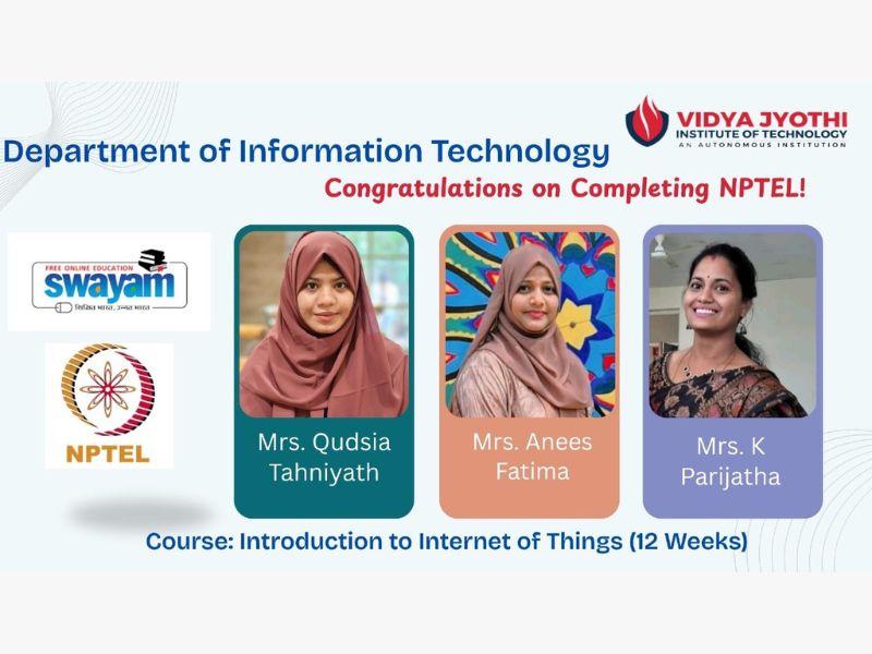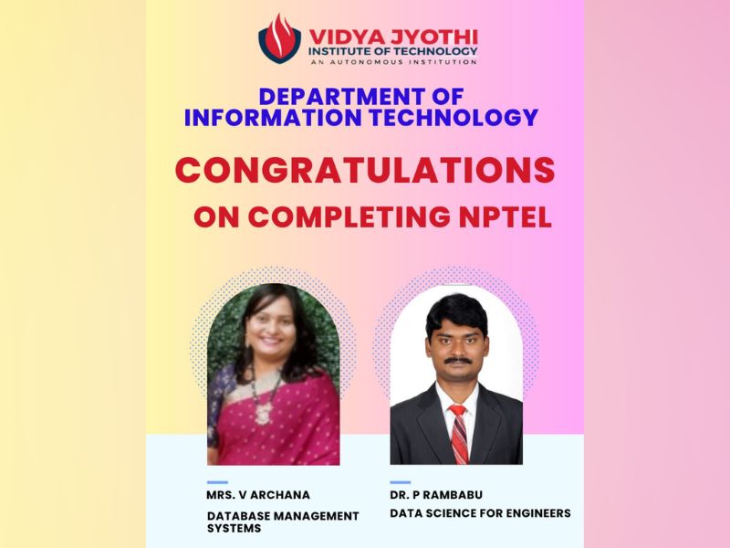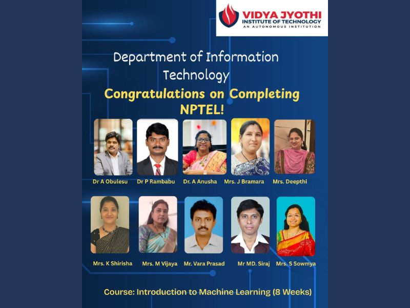 The Department of Information Technology at Vidya Jyothi Institute of Technology (VJIT) proudly congratulates its faculty members for successfully completing various NPTEL certification courses, showcasing their dedication to continuous learning, professional growth, and academic excellence.
