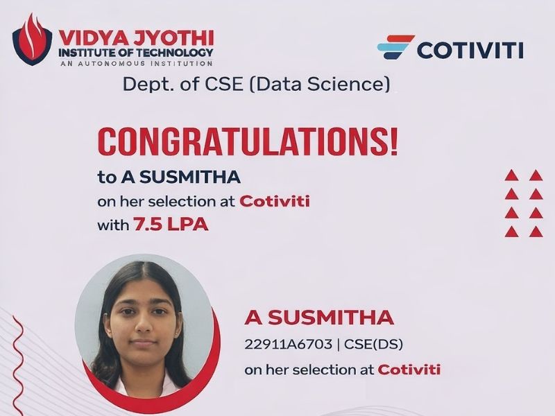 The Department of CSE(Data Science) proudly congratulates A. Susmitha (22911A6703) on being successfully selected by Cotiviti with an impressive package of 7.5 LPA.