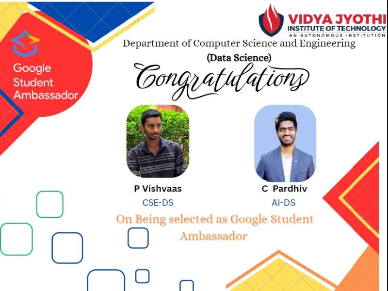 The Department of CSE(Data Science) is proud to announce that P. Vishvaas (22911A6745) and C. Pardhiv (22911A7212) have earned the prestigious recognition of being selected as Google Student Ambassadors. This distinction, associated with initiatives of Google, is awarded to students who demonstrate strong technical knowledge, leadership potential, and a passion for fostering innovation within the student community.