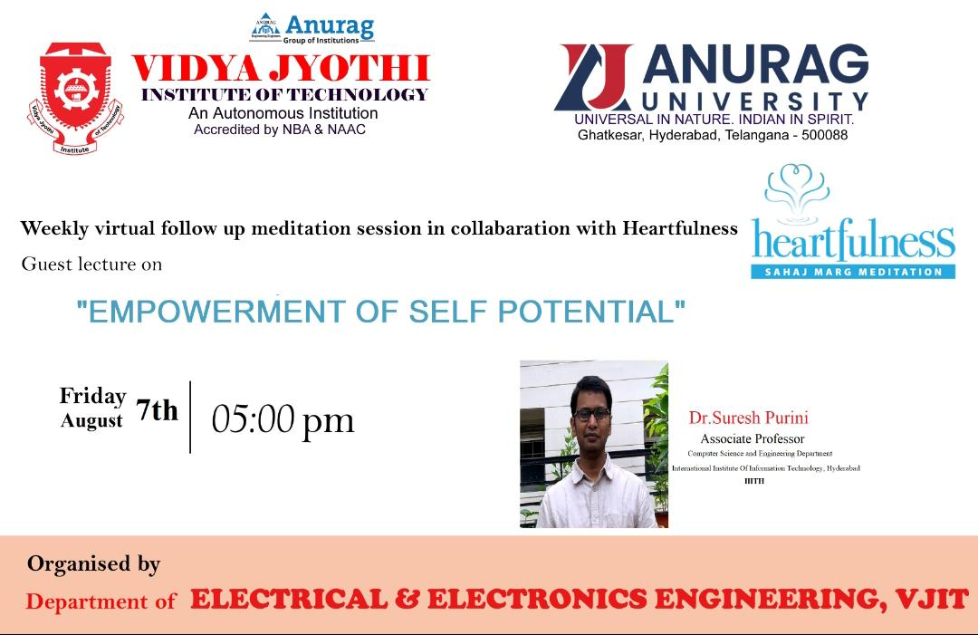 The Department of EEE has organized a Guest Lecture on 7th  August on “Empowerment of Self Potential” by Dr Suresh Purini, Associate professor, Department of CSE, IIITH.