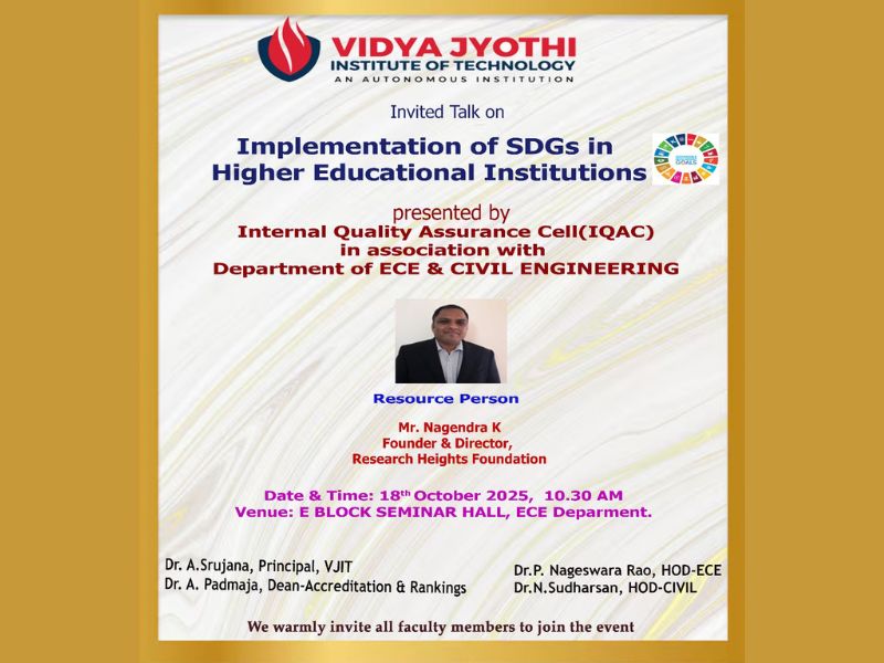 In this context, the IQAC of VJIT, in association with the Departments of ECE and Civil Engineering, is organizing a session on SDGs on 18th October. The session aims to enhance faculty understanding and encourage active participation in advancing these global goals through academic and institutional initiatives.