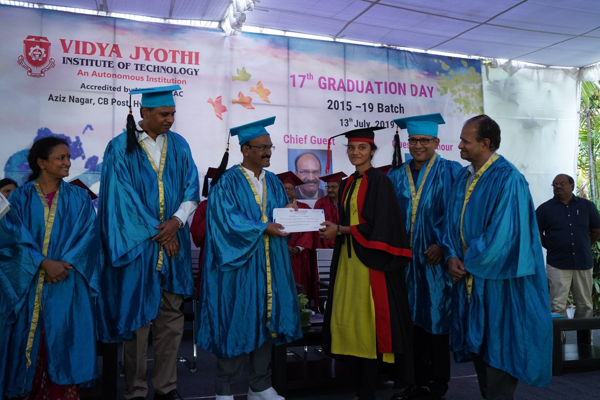 Henry Ford wisely said, “Coming together is a beginning; keeping together is progress and working together is success.” To realise his wise words and make it into reality, graduation day was organised with great fervour on the VJIT campus on 13 July, 2019. Dr. P Rajeshwar Reddy, VJES, Dr. P. Venugopal Reddy, Director, Dr. A. Padmaja, Principal, Convenor, Dr. V.V. Satyanarayana Sr. Administration Officer Mr. Venkatachalam and other ace members of VJIT hosted the ceremony inviting Dr.B. Janardhan Reddy, Secretary, Education Dept, Telangana as our Chief Guest and Mr. Lokesh Nath, Founder DiSRuPPt Thinking and TEDx Speaker as our Guest of Honour. Chief Guest Dr. B. Janardhan Reddy who inaugurated the programme insisted the students on not just being confined to jobs, but on evolving as dynamic entrepreneurs on par with the societal and global demands. On this special occasion, Dr. Palla Rajeshwar Reddy, Correspondent & Secretary articulated that VJIT has been relentlessly striving on maintaining and offering quality education to its students, keeping in phase with the emerging technologies and current market demands. Dr. P. Venugopal Redddy, Director and Dr. A. Padmaja, Principal commended the students and parents on this incredible moment and attributed the success to the common goal that the students and the management have been working on together. The Guests felicitated the institution topper with Late Sri P. Raghava Reddy Memorial Gold Medal, honoured the department toppers with Cash Awards and presented the successful students with Graduation Certificates. The programme ended with gleaming and satiating faces of the prized graduates and their families. VJIT is inordinately proud of the future global leaders!