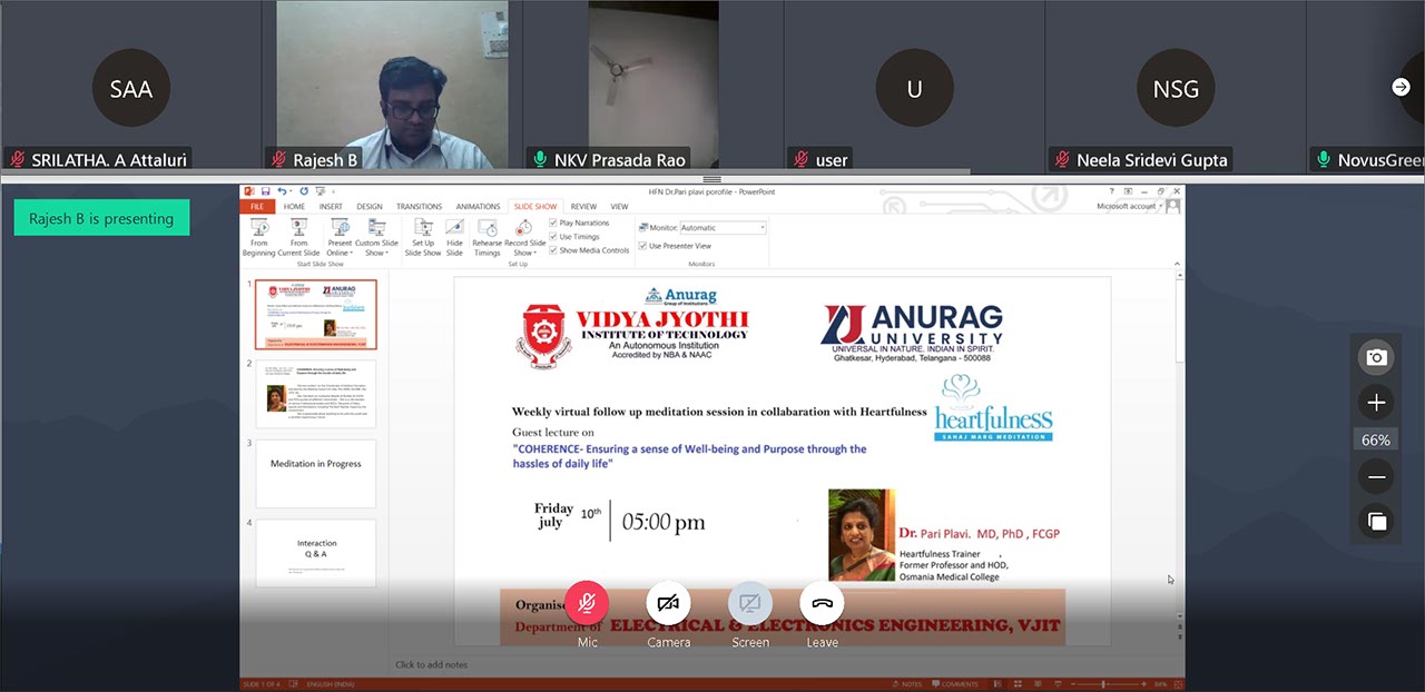 The EEE Department has organized a Guest Lecture on “ Coherence – Ensuring A sense of Well- Being and Purpose through the Hassles of Daily Life” by Dr Pari Plavi, MD, Ph. D, FCGP, Former Professor and HOD, Osmania Medical College on 10th July 2020.
