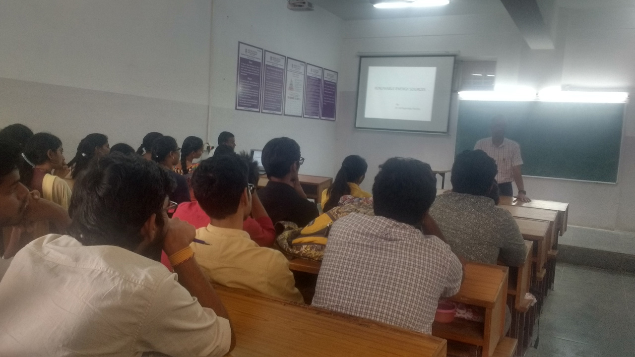 A Guest Lecture on “Renewable Energy Sources” was conducted by the department of EEE, on 19th December, 2019. The Guest Speaker Dr. M. Rajender Reddy, spoke on the various Types of Renewable Energy sources and their importance. He also gave an insight on the concepts of Wave Energy Conversion and Electricity Production while emphasizing on Types of Turbines, Solar Energy and their Applications.