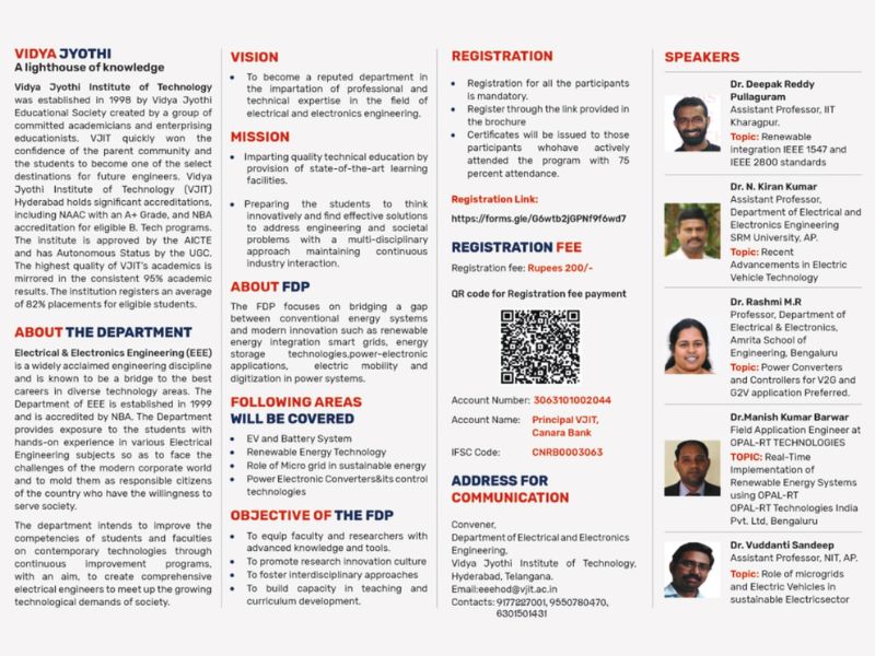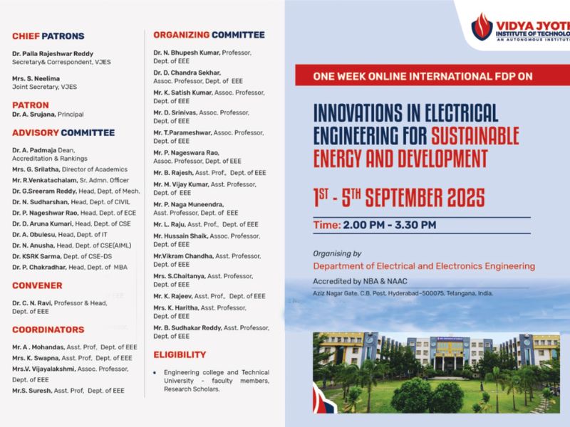This One Week International Faculty Development Programme aims to provide a global platform for researchers, academicians, and professionals to discuss innovations in electrical engineering that drive sustainable energy and development. The sessions will focus on cutting-edge technologies, renewable integration, smart grids, and modern practices shaping the future of power and energy systems.