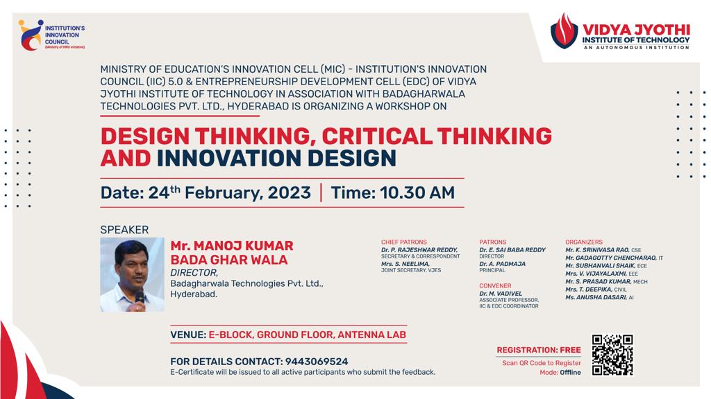 Ministry of Education’s Innovation Cell (MIC) – Institution’s Innovation Council (IIC) 5.0 & Entrepreneurship Development Cell (EDC) of Vidya Jyothi Institute of Technology in association with Badagharwala Technologies Pvt. Ltd., Hyderabad is planned to conduct offline session on “Design Thinking, Critical thinking and Innovation Design” on 24.02.2023 @ 10.30 AM, E Block, Ground Floor, Antenna Lab by the expert Mr.Manoj Kumar Bada Ghar Wala, Director, Badagharwala Technologies Pvt. Ltd., Hyderabad.