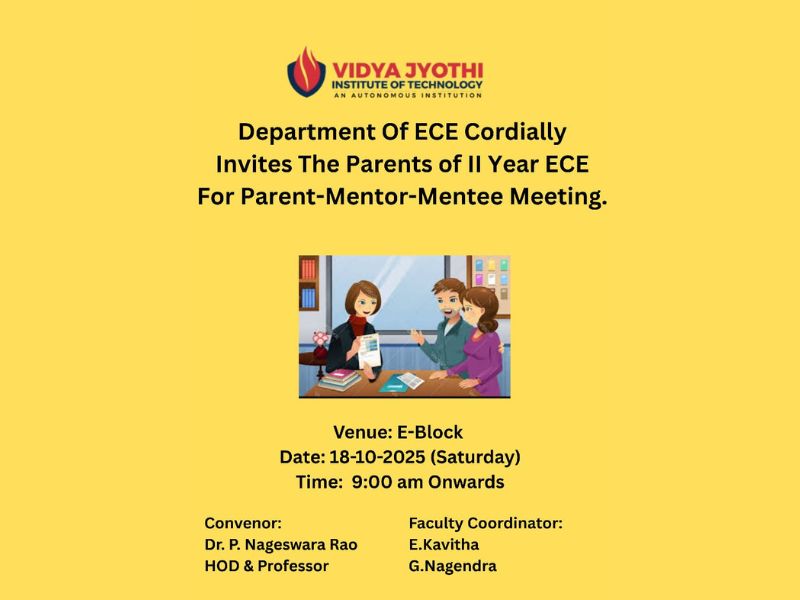 The Department of Electronics and Communication Engineering (ECE) at VJIT will be hosting a Parent-Mentor-Mentee Meeting on 18th October 2025 (Saturday). The meeting will commence at 9:00 AM onwards.