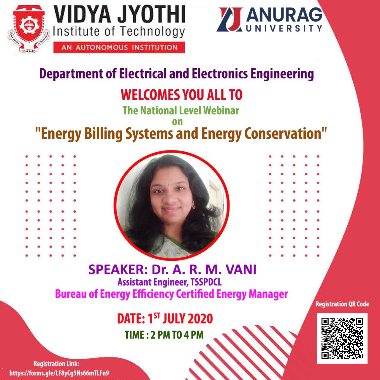 The Department of EEE has conducted a Webinar on “Energy Billing Systems and Energy Conservation” by Dr A. R. M. Vani on 1st July 2020. Dr Vani has emphasized on the importance of Energy Conservation and why to understand how the energy billing management system can be beneficial to business planning.